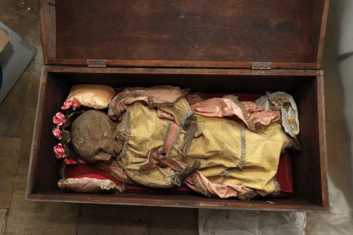 Mumija na glavi ima venac od ruža i odevena je u starinsku haljinu. Na drvenoj kutiji u kojoj je bila prikačen je papirić na kom piše 'San Prospero' i datum 25. septembar 1977.