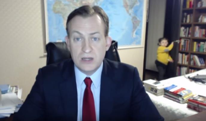 On je trebalo da se uključi u razgovor sa voditeljem BBC-ja, ali se sve poremetilo kada je u kancelariju ušla njegova ćerka plešući, beba u hodalici, a potom i supruga.