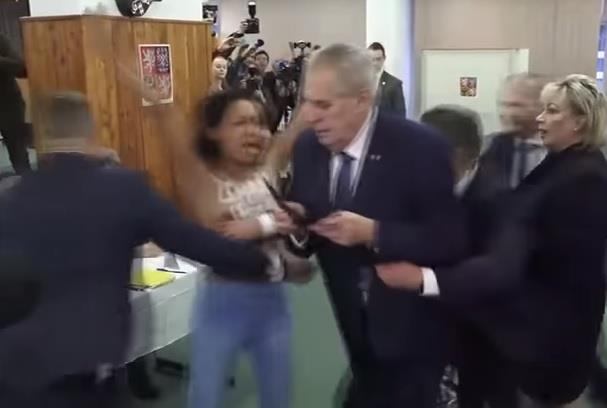 Češkog predsednika Miloša Zemana danas je tokom prvog kruga izbora za predsednika Češke umalo oborila Ukrajinka obnaženih grudi koja mu je prišla na biralištu u Pragu uzvikujući "Zeman Putinova drolja", a istu poruku ispisanu belom bojom na golim grudima pokazala je svima.