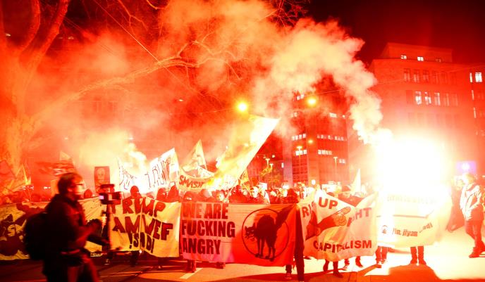 Na protestnom skupu u Cirihu demonstranti su uzvikivali "Tramp nije dobrodošao" i nosili plakate sa natpisima "izbacite Trampa" i "Uništite svetski ekonomski forum" i "Švajcarska je domaćin nacistima".