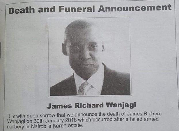 "Sa dubokom tugom javljamo da je preminuo James Ričard Vanjigi", stoji u čitulji sa namerno pogrešno napisanim imenom. Dodaje se da je poginuo u pljački u bogatom delu Najrobija. U čitulji su navedena imena njegove supruge i dece i informacije o sahrani.