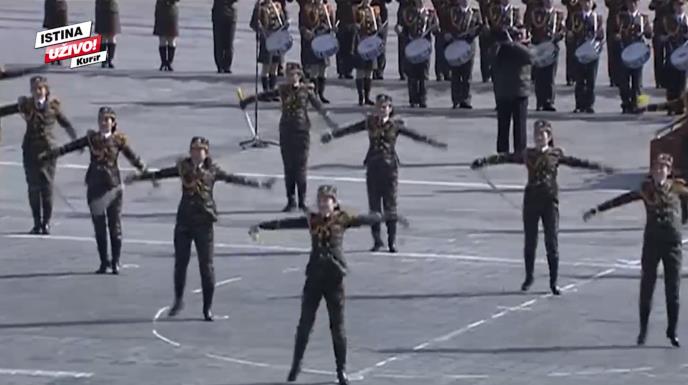 Današnja prada u Pjongjangu možda nije bila najveća, ali su su sa najvećom pažnjom propraćene dve situacije.Pripadnice specijalnih jedinica Severne Koreje odplesale su sa mačevima i pokazale da da pripadaju eliti.Međutim, sve oči bile su uprte u velikog vođu,između ostalog i zbog njegove odevne kombinacije, koja je pojedine modne stiliste podsetila na čuvenog Al Kaponea