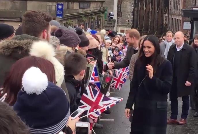 Veliki broj poštovalaca kraljevske porodice okupilo se kod zamka Edinburg da pozdravi buduće mladence. Megan je, u skladu sa škotskom tradicijom, nosila kaput kariranog dezena.