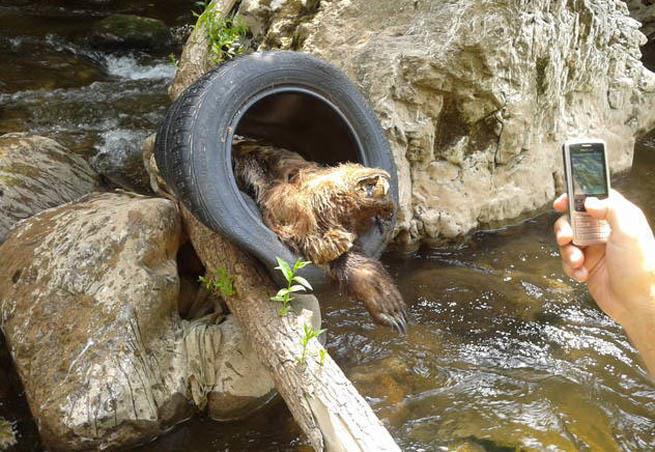SARAJEVO - Bizarna scena zabeležena je u Sarajevu, u koritu reke Miljacke – slika mrtvog medveda sa automobilskom gumom oko vrata. Tačan uzrok smrti životinje, koja je najverovatnije stigla s Trebevića, nije poznat.