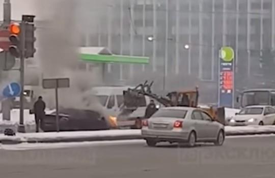 Intervencija jednog bageriste na zapaljenom automobilu privukla je pažnju prolaznika u Sankt Peterburgu.