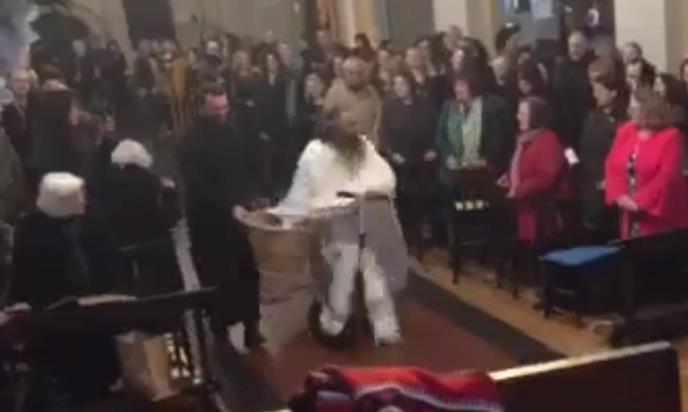 Na oduševljenje prisutnih vernika, pop je u dugačkoj beloj mantiji i na trotinetu uleteo u crkvu i počeo da pravi krugove dok su za njim trčala ostala sveštena lica.
