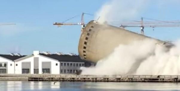 Tokom rušenja silosa u Danskoj prošle nedelje došlo je do velike greške i toranj se srušio na pogrešnu stranu i zdrobio susednu zgradu.
