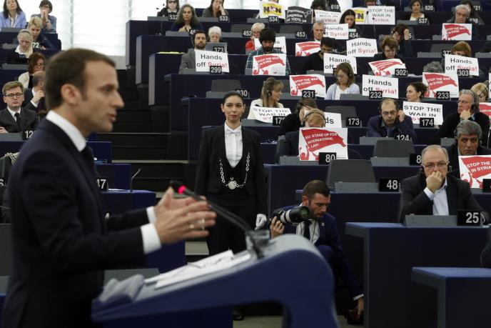 Kako su ranije preneli francuski mediji, Makron u govoru želi da oživi svoje ambicije o obnovi Evrope, koje za sada nisu naišle na veliko oduševljenje pojedinih zemalja. Štaviše, svi evroposlanici su tokom njegovog govora digli natpise "Dalje ruke od Sirije" i "Zaustavite rat u Siriji".