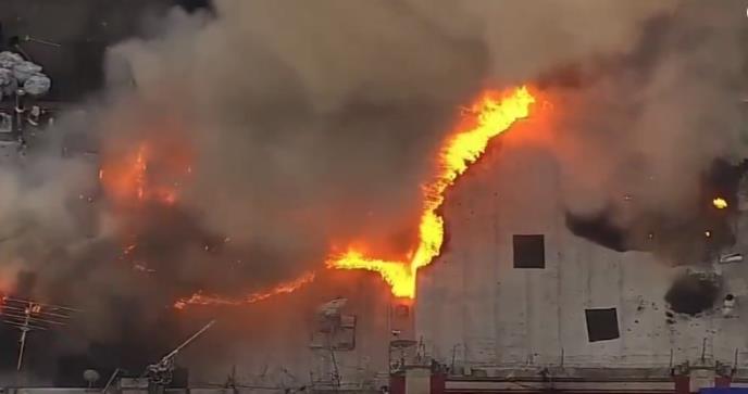 Slike iz vazduha pokazuju da vatrogasci pokušavaju da ugase plamen sa merdevina. Smatra se da je izgorelo najmanje osam trgovina, dok su blokirana četiri okolna kvarta.