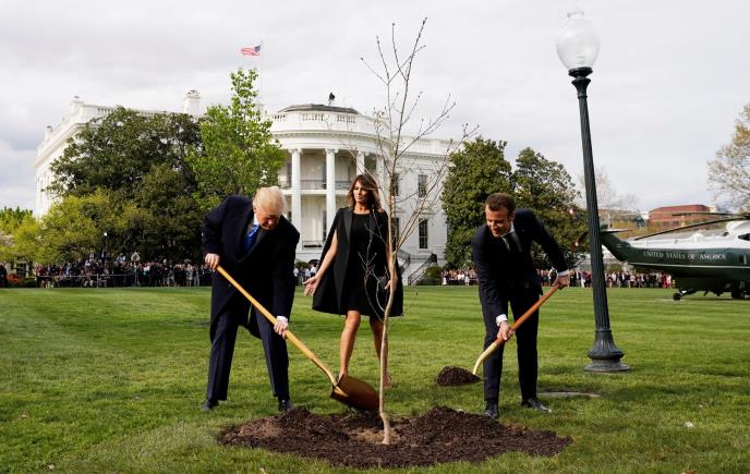 Tramp i Makron su prošle nedelje u prisustvu supruga i fotoreportera posadili hrast koji je francuski predsednik poklonio kao znak dugih prijateljskih bilateralnih odnosa.