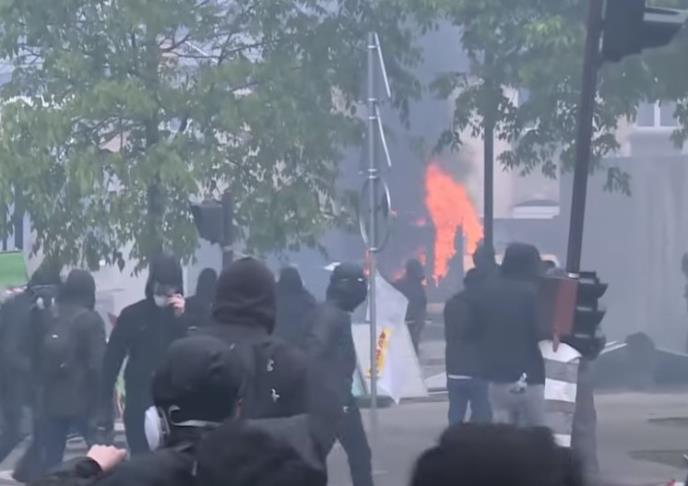 Više od hiljadu maskiranih demonstranata u crnom izazvalo je nerede na prvomajskim demonstracijama u Parizu, razbijajući prozore, bacajući molotovljeve koktele i paleći automobile.