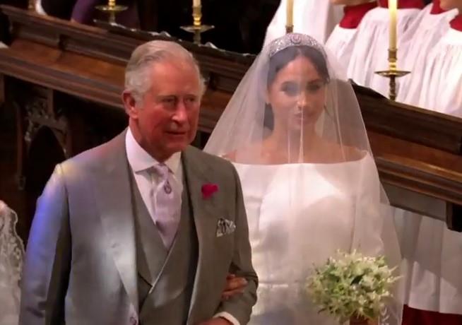 Kako njen otac nije prisutan na ceremoniji zbog skandala oko spornih paparaco slika i navodne bolesti, mladu je pod ruku držao Čarls.
