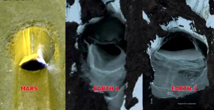 Misterije je u tome što na Zemlji postoje slična udubljenja, što je dodatno podstaklo mišljenja ufologa kako pronađeno udubljenje na Marsu nije slučajnost već su uvereni da su rupe povezane, da i na Zemlji postoje podzemne baze.