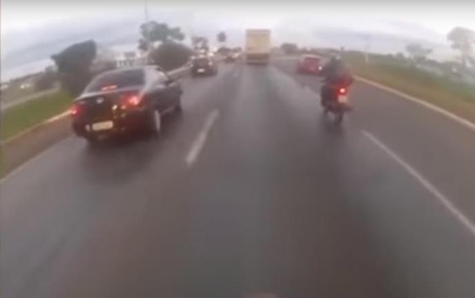 Na početku snimka vidi se čovek na motoru, a onda se iznenada pojavljuje točak koji kroz vazduh ide pravo ka vozaču.