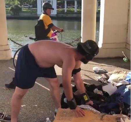 Muškarac u opremi za trčanje, go do pojasa, prikazan je na snimku kako besno baca u vodu a potom i u đubre sve što je nesrećni beskućnik imao u životu.