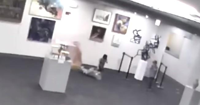 Nadzorne kamere pokazuju kako dečak korača prema skulpturi, obavija ruke oko nje u pokušaju da je zagrli, dok njegova majka Šenon Gudman i drugi odrasli razgovaraju na sofama u blizini. Slučajno je skulpturu malo pogurao, a ona se srušila prema njemu. Nastala je šteta na zadnjoj strani glave i ruke, a dečak je zadobio par ogrebotina na licu.