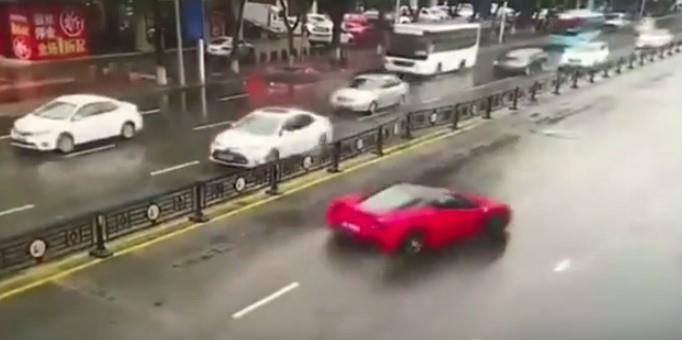 Snimak iz kineskog grada Venlinga pokazuje da je žena vozač ispala iz "ferarija 458" vrednog 500.000 funti nakon što je izgubila kontrolu zbog klizavog kolovoza.