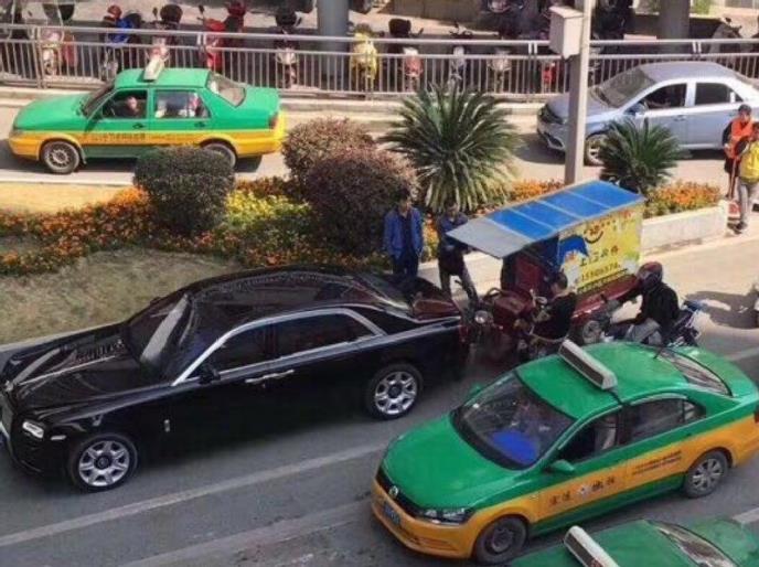 Na internetu se pojavilo nekoliko fotografija koje prikazuju kako je vozač trotočkaša za dostavu udario u skupoceni "rols-rojs".