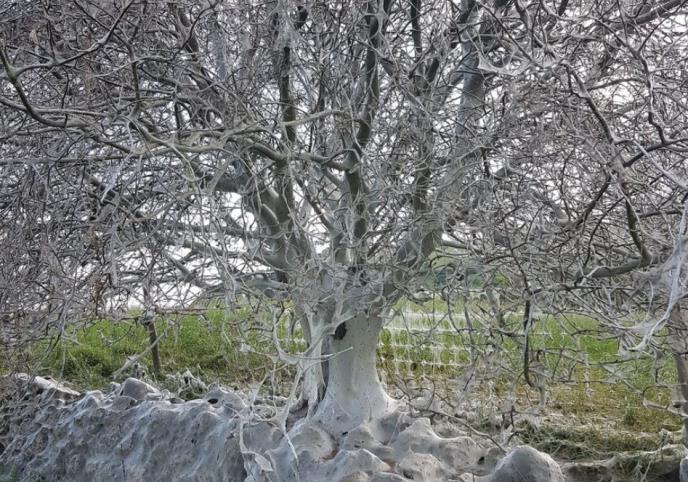 Larvama moljaca su bili potrebni dani kako bi izgradili ogromnu, svilenu čauru, koja se obično gradi preko izvora hrane, a sve kako bi se gusenice zaštitile od predatora, kao što su ptice, ose i pauci.