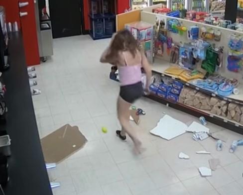Međutim, kako kamere pokazuju, u jednom trenutku je propala i pala na pod. Jedino što je ukazivalo na incident bile su dve ploče na plafonu koje su nedostajale i ulubljena polica sa robom.