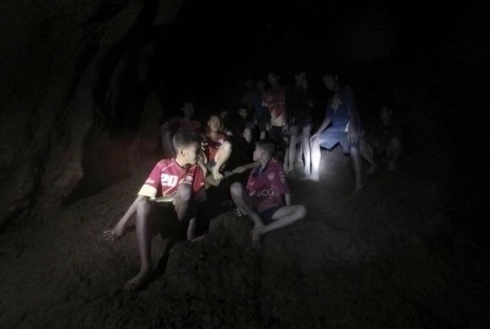 Na video-snimku koji su spasioci objavili, vide se dečaci, pod svetlošću baterijskih lampi, kako u šorcevima i crveno-plavim majicama sede ili stoje na steni iznad vode.