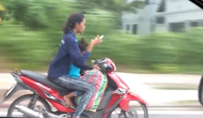 Tajlanđanka je snimljena kako u isto vreme na auto-putu vozi moped, drži malo dete ispred sebe i kuca poruke!