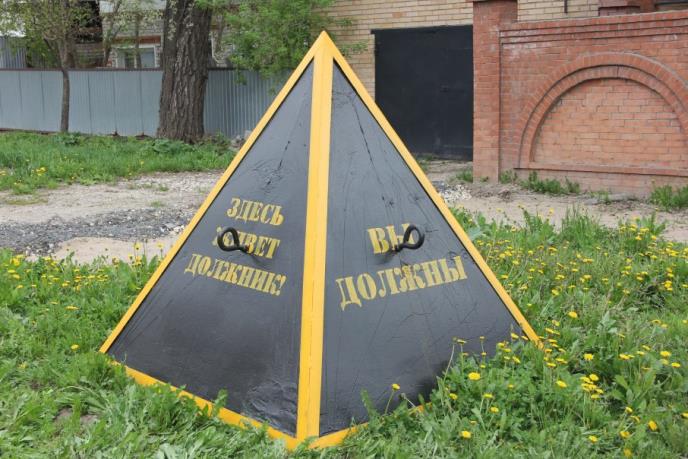 Komunalne službe iz ruskog grada Samare počele su još u maju ove godine da na ulicama, ispred kuća tvrdokornih neplatiša, postavljaju tri tona teške betonske piramide visine i širine 150 cm, sa ispisanim porukama "Ovde živi dužnik", "Platite dug za vodu", "Dužni ste".
