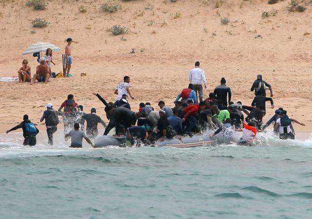 U tragikomičnoj sceni koju su u petak snimili fotografi, migranti odmah po pristanku iskaču iz čamca i beže na sve strane prema šumi kako bi izbegli špansku policiju.