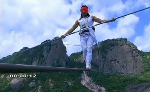 On je pokušao da hoda unazad po 700 metara dugačkom konopcu, sa povezom na očima, koristeći se samo šest metara dugačkom šipkom da bi održao ravnotežu.