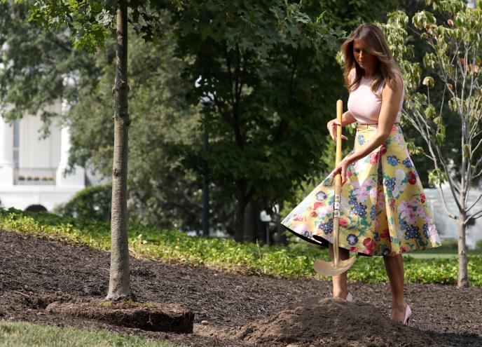 Zajedničkim snagama posadile su sadnicu dobijenu iz Ajzenhauerovog stabla hrasta smeštenog uz istočno krilo Bele kuće, a mnogima je zapalo za oko Melanijino mučenje sa balansiranjem na zemlji u vrtoglavo visokim potpeticama koje su se u navedenoj prilici pokazale i te kako neprikladnim odabirom.