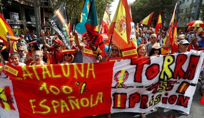 Hiljade Španaca danas protestuje u Barseloni protiv otcepljenja Katalonije, a demonstrante, koji traže nacionalno jedinstvo, pozdravljali su ljudi sa balkona, mašući im španskim zastavicima.