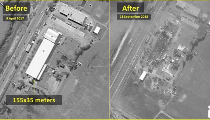 Na satelitskim fotografijama, datiranim na 18. septembar, vidi se potpuno uništenje zgrade dimenzija 155 puta 35 metara — manji objekti koji je okružuju su bez vidljivih oštećenja.