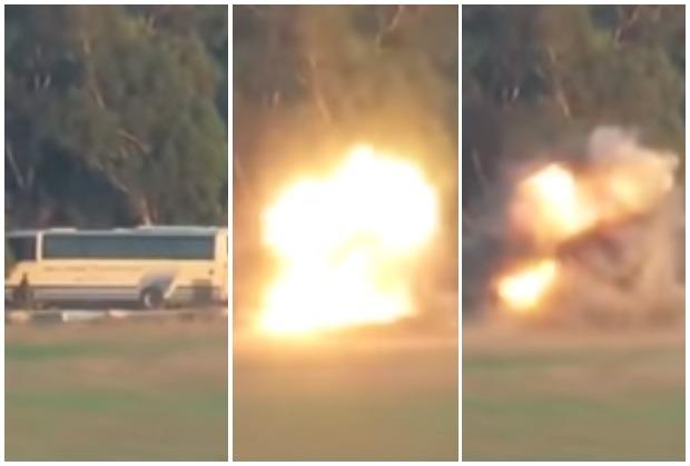 Na snimku se vidi kako palestinska raketa pogađa izraelski vojni autobus koji je bio inicijalna kapisla za eskalaciju sukoba u Pojasu Gaze.