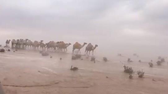 SAUDIJSKA PUSTINJA KAKVU DOSAD NISTE VIDELI: Sve je poplavljeno, a kamile idu polako kroz oluju (VIDEO)
