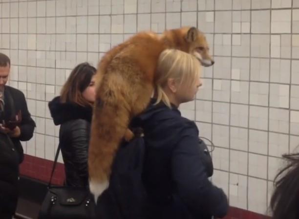 Na snimku se vidi kako ona mirno čeka voz, dok je joj lisica sedi na ramenu.