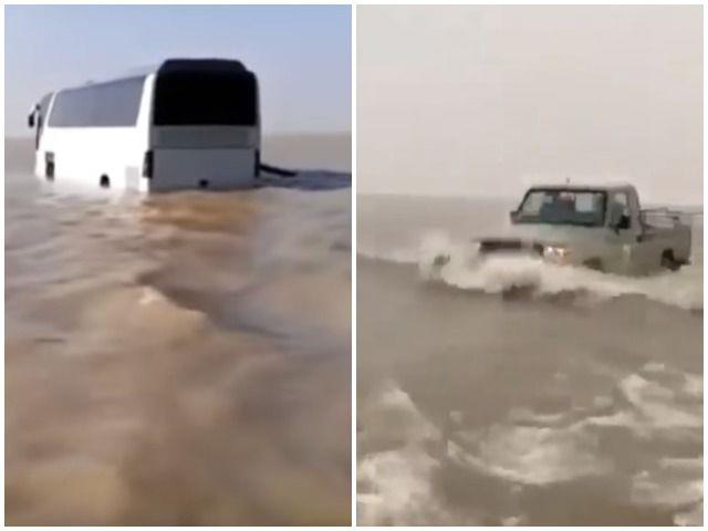 Na prvom video snimku se mogu videti vozila koja se kreću kroz vodu koja je prekrila pustinju. Na drugom se vide vozila koja stoje u vodi koja se prostire u nedogled.