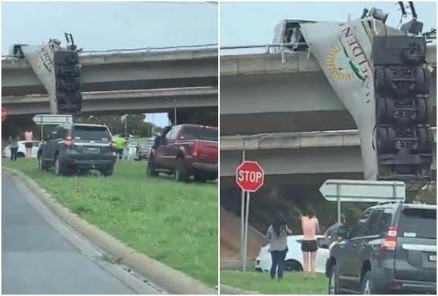 Kamion koji je prevozio prehrambene proizvode ostao je da visi s mosta u australiskoj saveznoj državi Viktoriji.