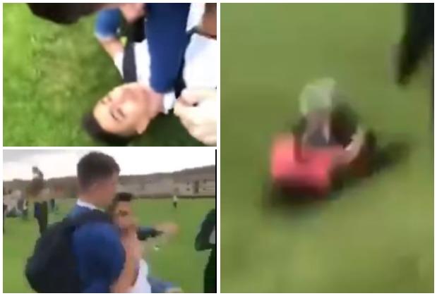 "Udaviću te", čuje se kako viče napadač koji zatim obara dečaka na zemlju i gura mu flašu sa vodom u usta i poliva ga po licu.