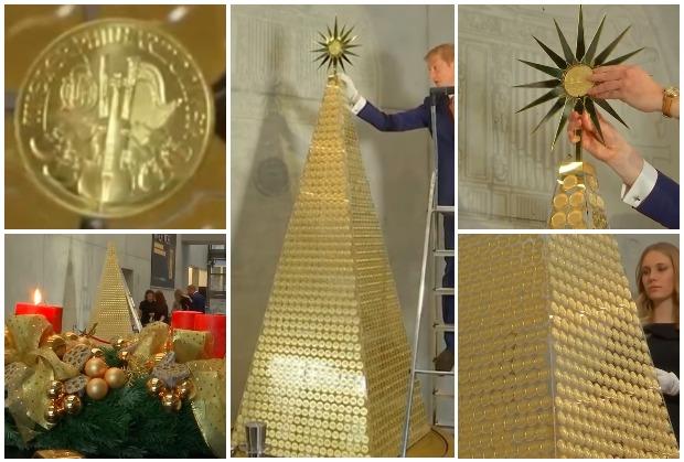 Ova jelka napravljena je od 2.018 zlatnih kovanica, a na vrhu joj je zvezda takođe od čistog zlata, kaže minhenska kompanija "Pro Aurum" koja je napravila ovo čudo od jelke.
