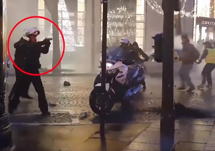 Policajac je izvadio oružje pošto su ga demonstranti na Jelisejskim poljima srušili sa motora, ali nije ispalio metak. Na snimku se vidi i kako drugi policajci šutiraju demonstrante koji ih napadaju.