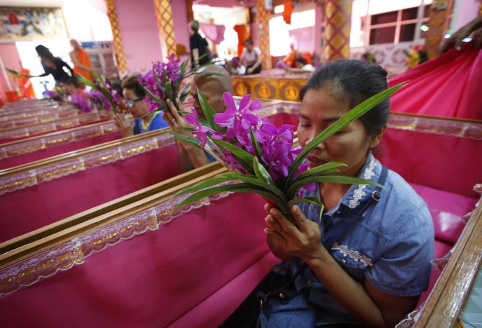 Dok mnogi Tajlanđani obeležavaju Novu godinu vatrometom, stotine vernika odlazi u hram Takien u predgrađu Bangkoka kako bi ležali u mrtvačkim sanducima tokom tradicionalnog ritauala.
