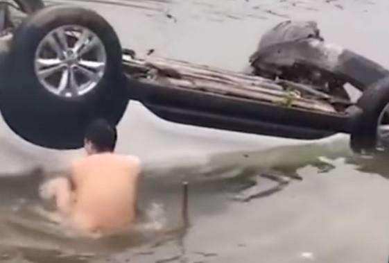 Srećom, u blizini je bio mladić koji je ne razmišljajući uskočio u ledenu vodu i pokušao da otvori vrata.
