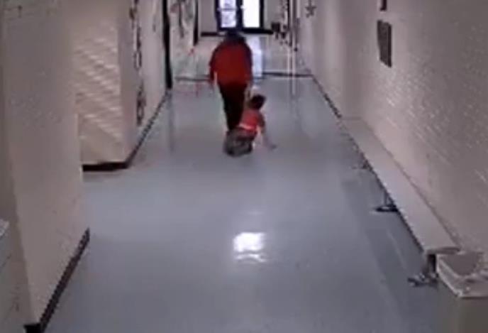 Na videu se čuje kako učiteljica pita dečaka može li da hoda, a kada joj on odgovara da ne može, ona nastavlja da ga vuče po hodniku.