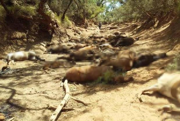 Rendžeri su pronašli prošle nedelje uginule životinje i konje na umoru u isušenom pojilu nedaleko od Alis Springsa. Oko 40 životinja uginulo je dehidracije i izgladnelosti. Ostale životinje kasnije su uspavane.