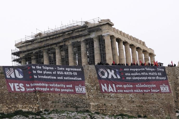 Demonstranti iz Komunističke partije Grčke postavili su rano jutros iznad zidina drevnog Akropolja dva ogromna transparenta protiv tog sporazuma.