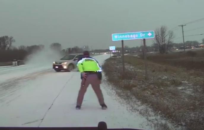 Koliko oprezno treba voziti po hladnom vremenu i zaleđenim kolovozima na svojoj je koži najbolje osetio jedan policajac iz američke savezne države Viskonsin kog je zamalo pregazio vozač koji je izgubio kontrolu nad svojim automobilom.