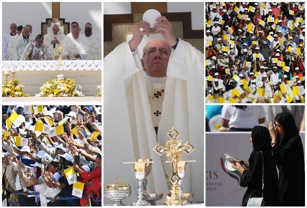 Papa je na službi govori na italijanskom i engleskom jeziku, uputio je moltvu za migrante i okončanje ratova. Dvodnevnu posetu Abu Dabiju papa je iskoristio da osudi ratove u svetu, i pozvao hrišćane i muslimane na veću saradnju.