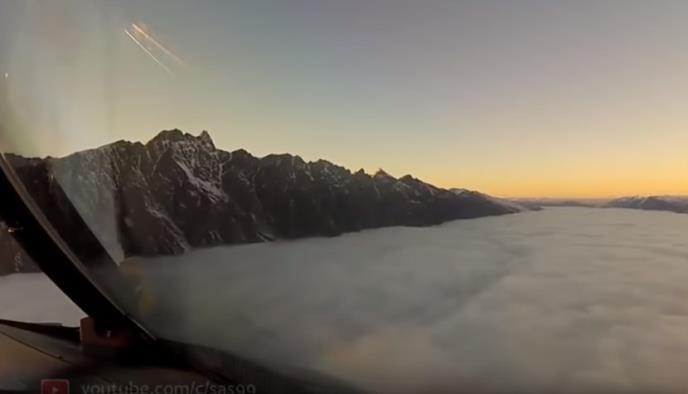 U jednom trenutku avion počinje da se spušta u oblake, a vrh jedne planine nalazi se odmah ispred njega.
