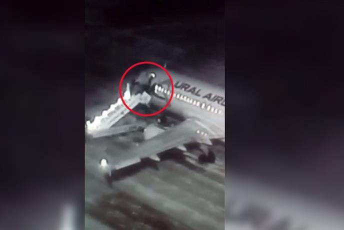Na snimku sa sigurnosnih kamera se vidi da se konstrukcija ruši direktno pod putnicima koji se ukrcavaju u avion "Ural erlajnsa". Šest ljudi pada na zemlju.