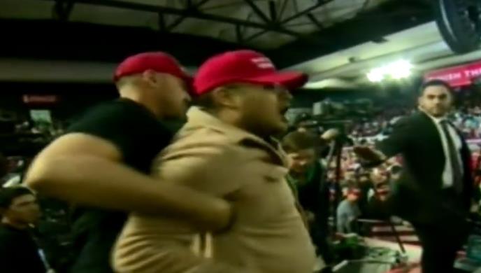 Muškarac, koji je nosio kačket sa Trampovim sloganom "Učinimo ponovo Ameriku velikom", gurao je i psovao snimatelja Rona Skinsa, pre nego što su ga odvukli.